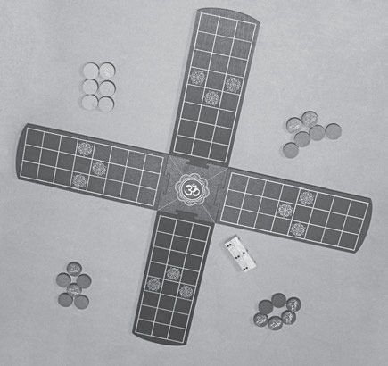 Устройство игры ньоут и его индийского прародителя, чаупара, достаточно символично. Традиционное поле для игры в ньоут представляет собой окружность, состоящую из 20 клеток, в которую вписан крест, состоящий еще из 9 клеток (см. цветную вклейку 1). Центр креста, а также клетки, где линии креста пересекаются с окружностью, называются «станциями». В чаупаре игровое поле выглядит крестообразно, и состоит в общей сложности из 97 клеток, включая центральный квадрат; каждый рукав креста разделен на три столбца из 8 клеток каждый. В обоих упомянутых играх каждому игроку предназначается по 4 фишки определенного цвета (всего 16 фишек) и их движение осуществляется против часовой стрелки. Если проводить аналогию с европейскими игральными картами, можно заметить, что в полной колоде обычно содержатся четыре фигурные карты в четырех мастях. Движение против часовой стрелки (навстречу солнцу) – движение к завершению. В индуистских, буддийских и джайнистских традициях обход священного места, как правило, осуществляется по часовой стрелке, исключение составляют похоронные обряды. Это связано с естественными жизненными процессами, поэтому направление посолонь ассоциируется с путем добродетели и гармонией, а противосолонь – с миром духов, движением от жизни. Тем не менее, буддисты, практикующие материнские тантры, совершают обход против часовой стрелки, что символизирует процесс завершения, самоосвобождение в недвойственную единую сущность.