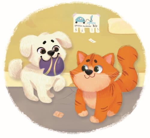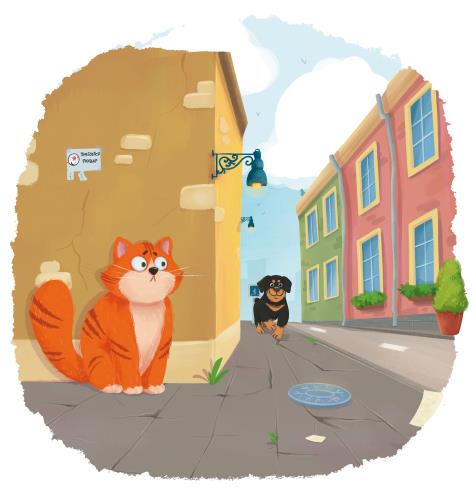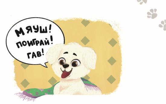 – Р-р-р, Мяуш, поиграй со мной! – виляет хвостом собака и радостно прыгает.