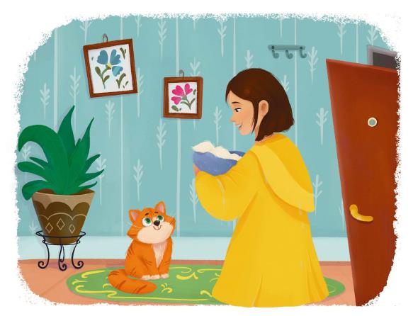 Сегодня целый день идёт дождь. Хозяйка пришла с улицы вся мокрая. А что это у неё в руках завёрнуто в шарфик? Точно, подарок для меня! Люблю сюрпризы! Разворачивай же скорее, мне снизу ничего не видно!