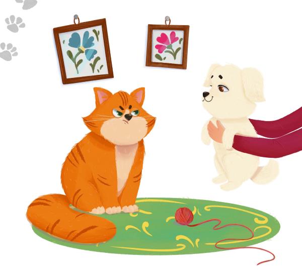 Из скомканного шарфа на меня смотрела мелкая лохматая болонка. Что происходит? Я не хочу ни с кем знакомиться, тем более с собаками. Вы же знаете моё отношение к ним! И что значит «будет жить с нами»? Меня кто-то спрашивал? Поставили перед фактом почётного члена семьи! Но Мяуш не будет делить жилплощадь с шумным и глупым существом! Это окончательное решение.