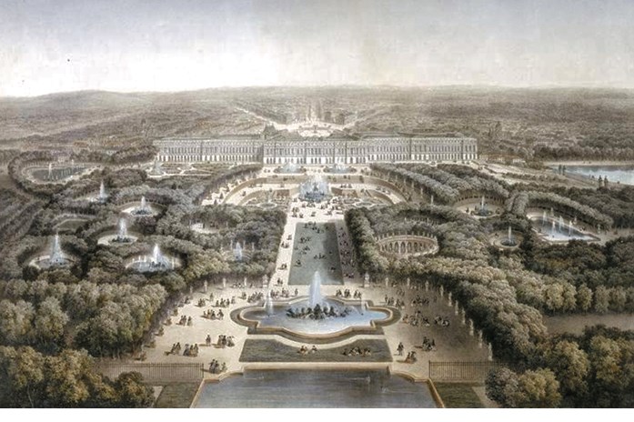 На своих лекциях я часто задаю вопрос: что на этой гравюре архитектура. Правильный ответ – всё, кроме линии холмов на дальнем плане. Архитектура – дворец и другие строения, планировка парка и малые архитектурные формы: фонтаны, лестницы, ограды. Архитектура – и трёхлучие, расходящееся тремя лучами дороги от площади перед дворцом, которое мы можем увидеть на дальнем плане. Этот градостроительный приём расходящихся лучами улиц – именно отсюда, из Версаля попадёт в Санкт-Петербург. Умение рисовать и изобразить ансамбль в перспективе – часть деятельности архитектора.
