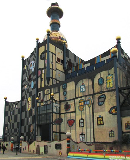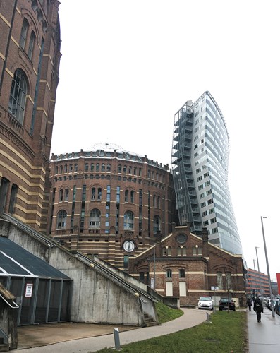 Четыре огромных Газометра были построены в 1896–1899 гг. для хранения газа, использующегося для освещения городских улиц. Технология менялась, появилось электричество и природный газ, эти газометры стали не нужны. При реконструкции они поменяли устаревшую промышленную функцию на общественно-жилую и превратились в жилые комплексы с магазинами, спортзалами, концертным залом. Проект реконструкции каждого из четырёх газометров выполняли разные архитекторы или архитектурные бюро. На фото газометр, который не просто был реконструирован, у него ещё появилась дополнительная пристройка в стиле «деконструктивизм». Теперь это и модное место, и туристический объект, и просто удобный жилой комплекс.