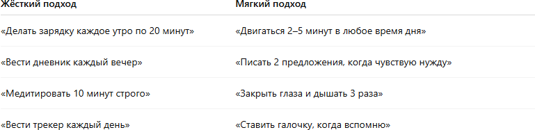 Когда ты ведешь себя с жесткостью («я должен(на)», «я обязан(а) не срываться»), мозг реагирует защитой. А когда ты разрешаешь себе быть гибким(ой), мягким(ой), пробовать разными путями – привычка имеет шанс закрепиться на уровне доверия, а не насилия.