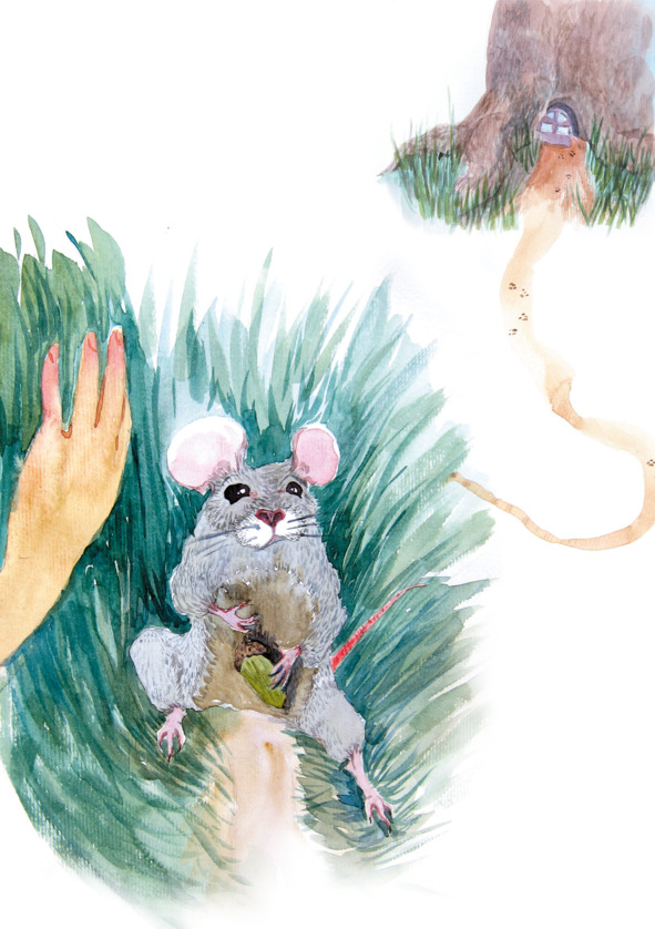 Малышка раздвинула траву и увидела две чёрные бусины глазок, уставившихся прямо на неё. Это была крохотная мышка с жёлудем в лапках.
