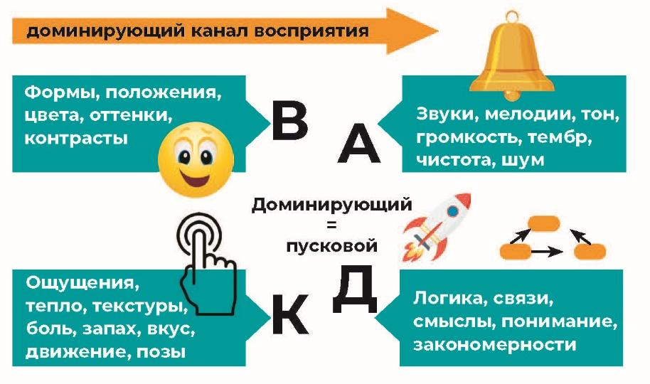 Из моего примера следует, что есть разные каналы восприятия информации, есть доминирующий и если его выяснить и пользоваться им, то вам будет сопутствовать успех.