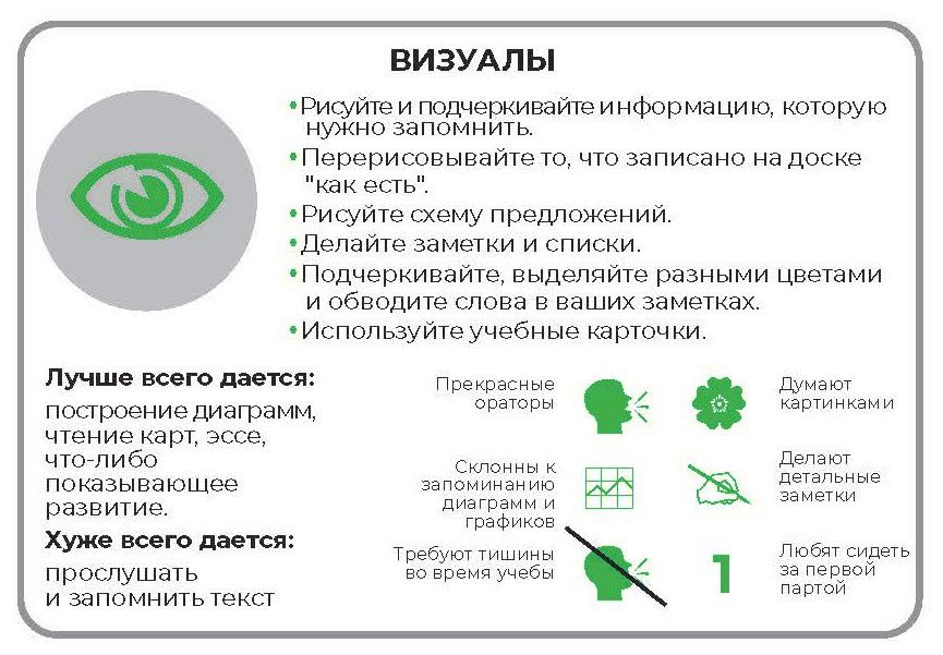 Визуалам надо показывать графики, картинки, фотографии. Они легче запомнят правило, если будут видеть его написанным на плакате яркими буквами.