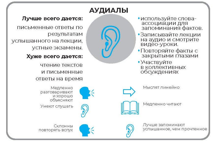 Аудиалу нетрудно узнать любого человека по голосу. У него прекрасная память и слух. Лучше не перебивайте аудиала – он этого не любит. «Слушатель» – большой любитель споров и невероятных историй, обожает музыку, знает на память много стихотворений, с удовольствием декламирует. Предпочитает учиться по лекциям и аудиокнигам, не любит читать и писать. По данным статистики, только 5% подростков являются аудиалами. Они воспринимают информацию на слух, часто используют в своей речи связанные с ним слова (послушай, обсуждать, громкий и т.д.).