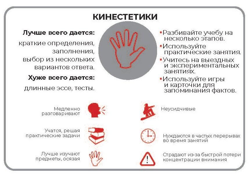 Большое внимание в разговоре уделяет передаче внутренних переживаний. Взгляд при этом устремлен не в глаза собеседника, а вниз. Старается как можно ближе приблизиться, прикоснуться к другому человеку. Детям такого типа сложно сосредоточиться, так как они постоянно отвлекаются по любому поводу. Их память активизируется во время движения, поэтому на занятиях могут постоянно теребить ручку или карандаш.
