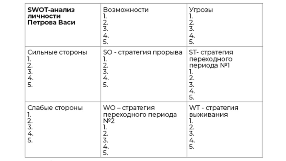 Анализ SWOT – это инструмент для планирования развития личности. С его помощью определяются сильные стороны, уязвимости, над которыми стоит поработать, и внешние факторы, которые способствуют или препятствуют достижению цели.