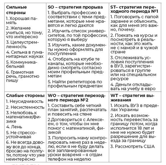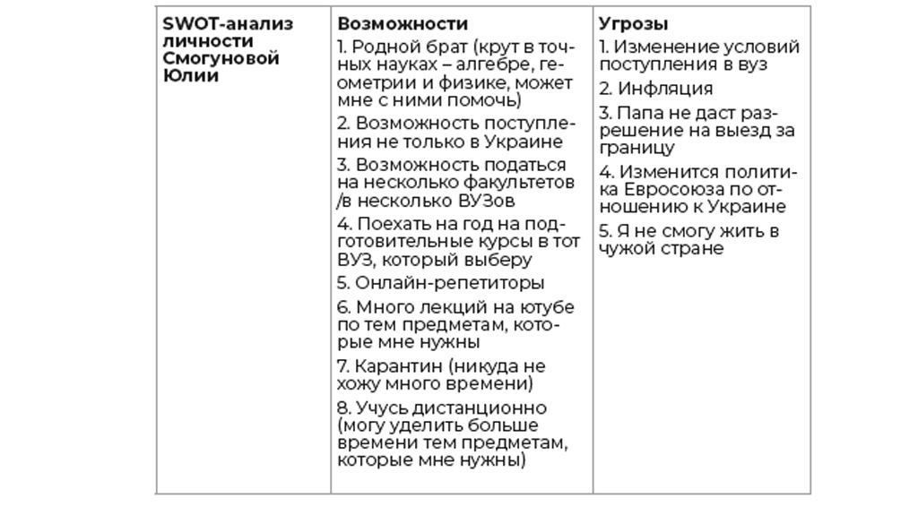 Приведу пример SWOT-анализа моей дочери, который мы делали, когда она не могла определиться, чем бы она хотела заниматься во взрослой жизни.
