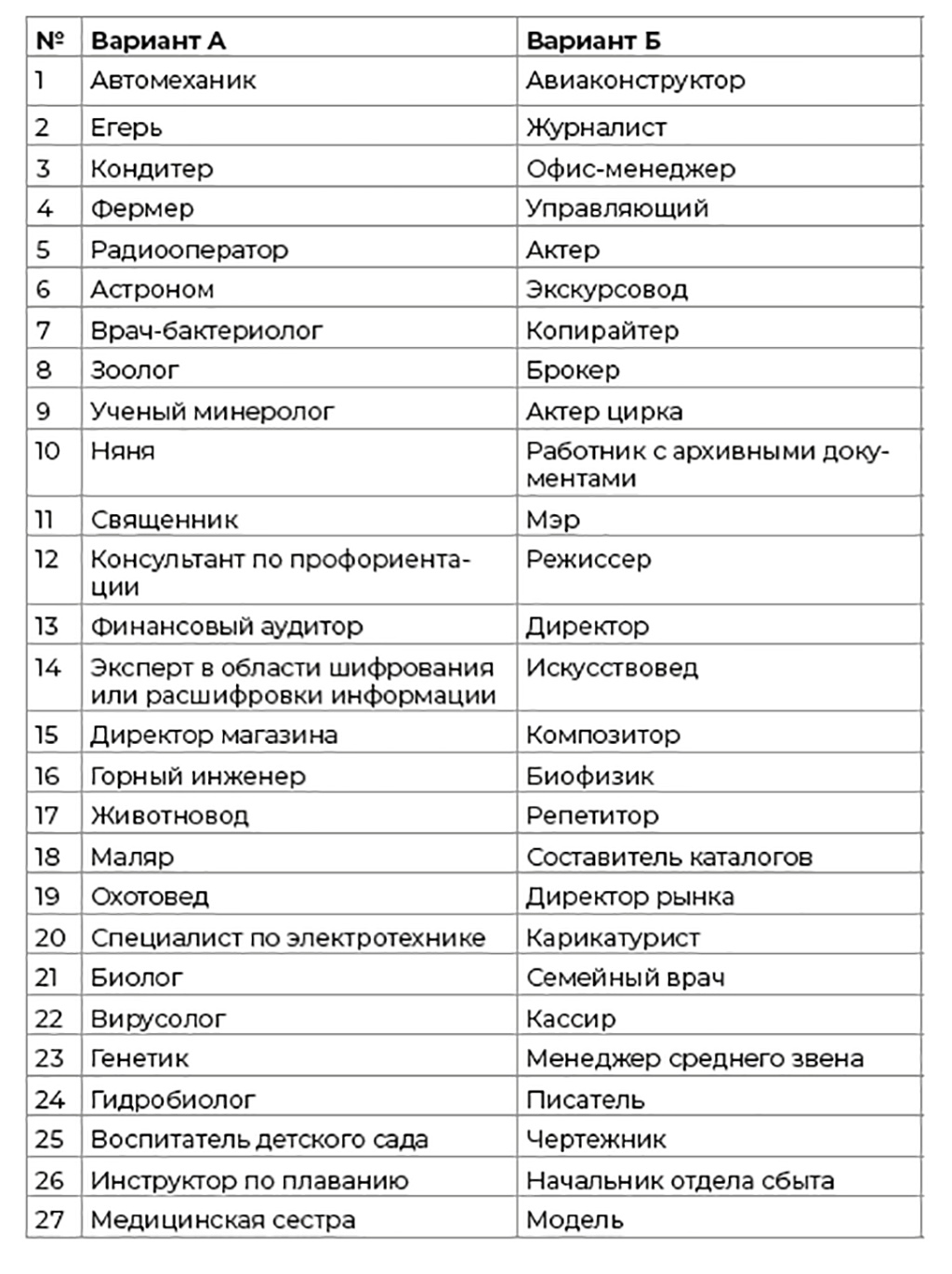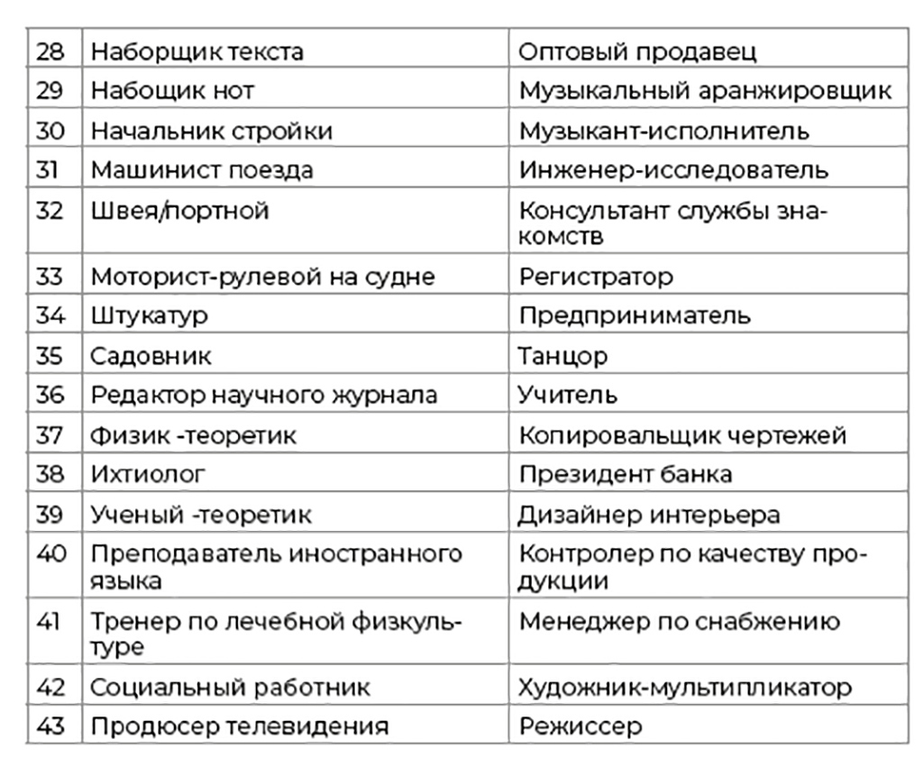 Вам предлагается 43 пары профессий, причем каждой паре Вы обязаны выбрать одну: наиболее желательную или наименее «противную».
