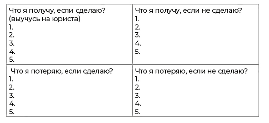 Данный план дает понимание, зачем мне уже сегодня заниматься с репетитором и делать домашку по алгебре. Обычно после этого шага уже достаточно понятно, стоит делать или нет. Но если ещё есть трудности, можно «взвесить» результаты. На одну руку мысленно кладёте «что вы получу, если сделаю» и «что потеряю, если не сделаю», на другую – «что получу, если не сделаю» и «что потеряю, если сделаю» (складываете области по диагонали). Что перевешивает – ваш выбор. Ещё вариант – можно добавить к каждому пункту уровень важности (вес), например от 0 до 10. Приобретения идут в плюс, потери в минус. Потом просто смотрим результат. За: 7+4+8+9+4+10-9-4-6-6=17. Против: 5+4+8+9-10-6-9=1. 17-1=16. 16 баллов в плюс за обучение в данной профессии. Такой вполне дигитальный, но наглядный вариант получается.