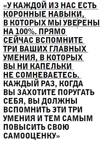 Что же делать? И зачем мы с вами вспоминаем три главных навыка? Кажется, что все очень просто. Каждый раз, когда вы захотите поругать себя, вы должны вспомнить эти три умения и тем самым повысить свою самооценку.