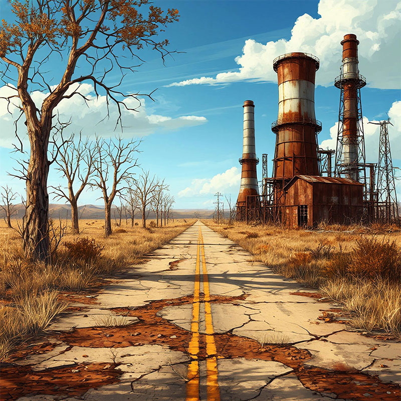Солнце беспощадно иссушило почву, превратив пейзаж в подобие лунной поверхности. Только редкие деревья с узловатыми ветвями и высокие колючие сорняки намекали, что когда-то здесь была жизнь. Разбитые конструкции и остовы старых машин лежали повсюду, словно немые свидетели ушедшей цивилизации. Время от времени встречались руины домов и гигантские заброшенные электростанции. Все вокруг наводило тоску.