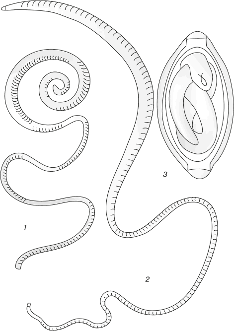 Рис. 1.1. Власоглав: 1 — самец; 2 — самка; 3 — личинка в яйце