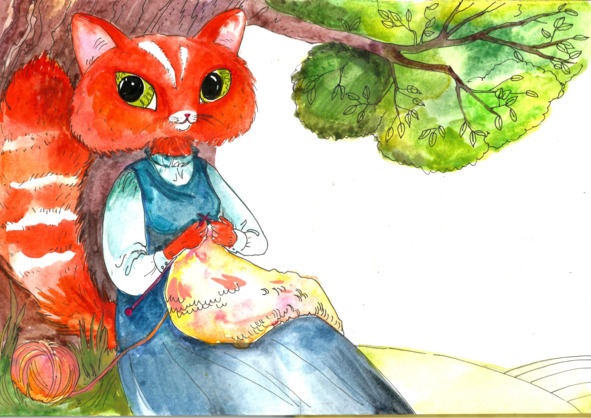 Кошка Мила сидела в тени раскидистого дуба и вязала пушистый шарф на зиму, когда к ней подбежал ее котенок.