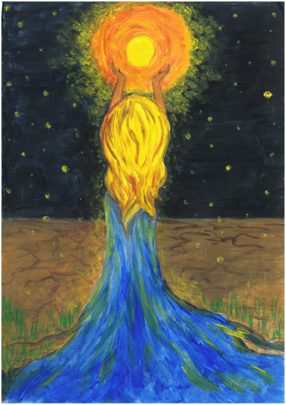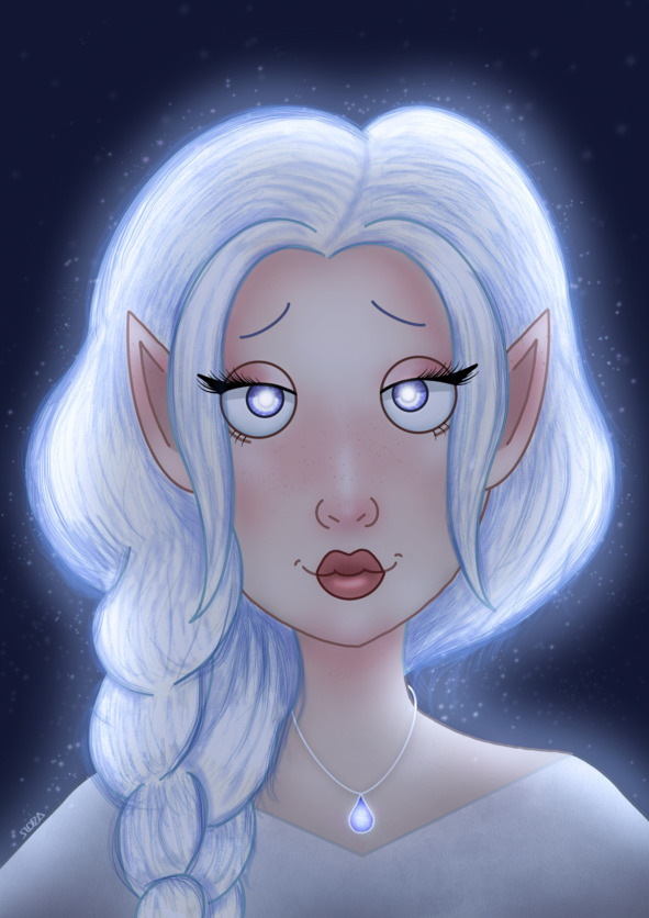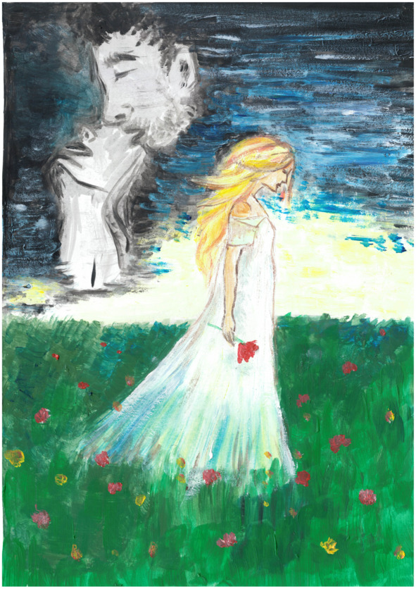 Течение реки остановило свое движение, вода стала подниматься, образуя фигуру девушки в белом одеянии. Ее длинные белокурые волосы, заплетенные в косу, светились под луной. Она сама словно была соткана из лунного света. Маленькие искорки быстро перемещались по контуру ее тела. Девушка вышла из реки и превратилась в обычного человека, спрятав свой свет внутрь себя. Медленно ступая босыми ногами по траве, она направилась за пастухом.