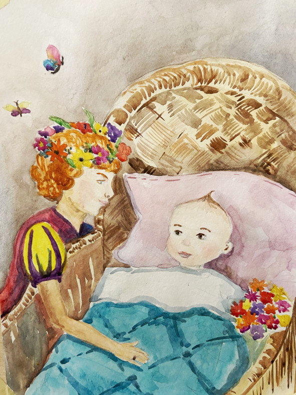 Внезапно зала озарилась теплым солнечным светом, на пороге появилась самая юная из ведуний Лето, она была смешливая и немного взбалмошная, и всегда везде опаздывала, как и сегодня. По дороге она отвлеклась, собирая душистые полевые цветы. Она подошла к колыбели Царевича, положила возле нее охапку собранных цветов, ласково взглянула на него и проговорила: