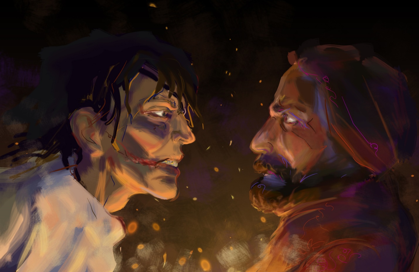 Времени на подготовку ушло немного. Когда Мясник давал указания, торговец не мог поверить, что в этом грязном месте могут быть отдельные кабинеты. И не ошибся: их разместили в подвале буквально в двух локтях от последней ступени за столиком, явно предназначавшимся для одного едока. Если бы любой из них вдруг решил расставить руки в стороны, то одна бы уперлась в стену, а другая – в грязную простыню, подвешенную навроде занавески, дабы «особых гостей» не смущали бочки, коробы, банки, бутылки и жирные крысы. Свечи стояли прямо на земле, что позволило теням сделать лицо наемника еще более пугающим.