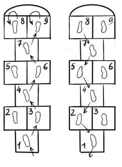 Двумя ногами в клетки «2,3». На одной ноге в клетку «4» и так далее. В клетку «8,9» двумя ногами, затем переворачиваемся и прыгаем в обратном направлении, по дороге забирая битку себе.