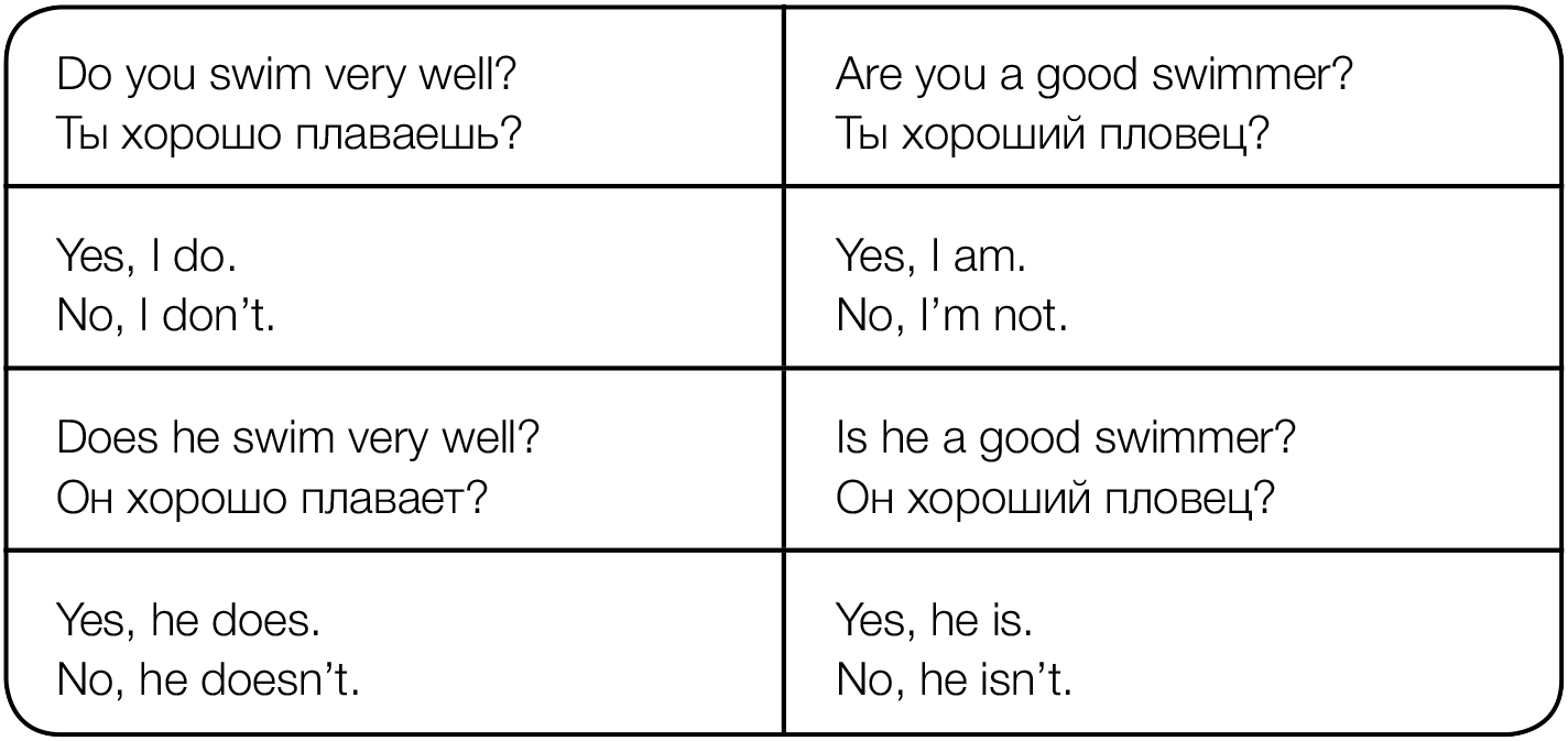 Обратите внимание, что смысл предложений – в принципе один и тот же. Но так же как и по-русски, говорящий по-английски может просто захотеть сказать о себе через глагол – действие «плавать», – а может захотеть описать себя существительным – пловец. Это выбор говорящего человека.