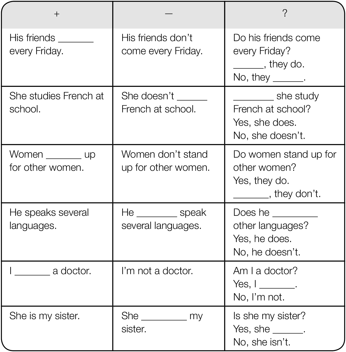 Чтобы легче запоминать времена и ситуации их использования, накапливайте «чемоданчик примеров» из мемов, цитат, строчек из песен и так далее. У многих моих учеников есть такие проверочные фразы, по аналогии с которыми можно выбрать правильное время. Если мы говорим «Я женщина» в Present Simple, то по аналогии можно предположить, что «Я счастлива», «Я врач», «Я танцовщица» будут строиться по тем же грамматическим правилам. Стоит выучить одну фразу-пример для времени, и можно сверяться с ней каждый раз, когда сомневаетесь. В каждую главу-урок я буду добавлять цитату известной женщины и/или отрывок из песни, которые помогут вам понять и запомнить время или другую грамматическую структуру. Особенно хорошо для запоминания фраз-примеров, фраз-клише работают песни, под музыку мы лучше запоминаем целые словосочетания, а не отдельные слова, ну и вообще – это весело! Уж точно веселее, чем зубрить таблички. Я делаю подробные разборы песен и словосочетаний из них в серии книг «Use your music!».