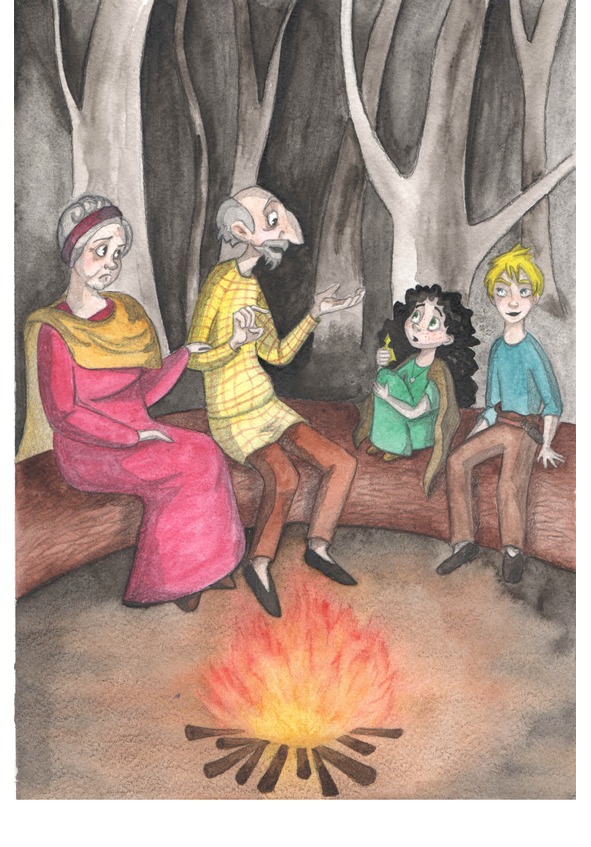 Келлану удалось собрать нужное количество веток и листьев. Уже почти совсем стемнело, и он разжег костер. Триста собрала грибы и нанизала их на палку, чтобы пожарить на огне. Сидя на бревне, они вытягивали к костру ладошки и грелись. Пламя костра завораживало, ощущалось тепло и становилось как-то уютнее.