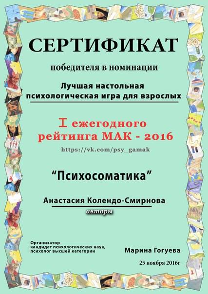 Игра «Психосоматика» признана лучшей психологической игрой 2016 года в Первом ежегодном рейтинге МАК в номинации «Лучшие настольные психологические игры для взрослых» в группе Марины Гогуевой «гаМАК» (https://vk.com/psy_gamak):