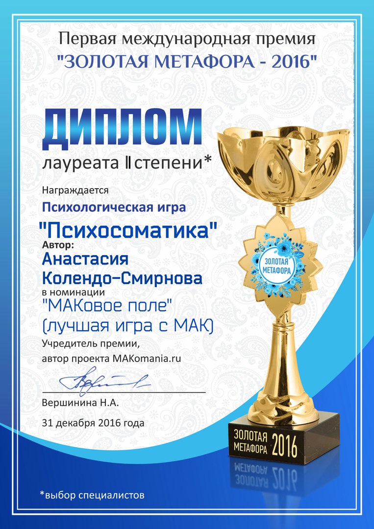 а также стала лауреатом конкурса «Золотая метафора – 2016» в группе Надежды Вершининой «Метафорические карты | ЭМОЦИИ СУДЬБЫ» (https://vk.com/makomania)