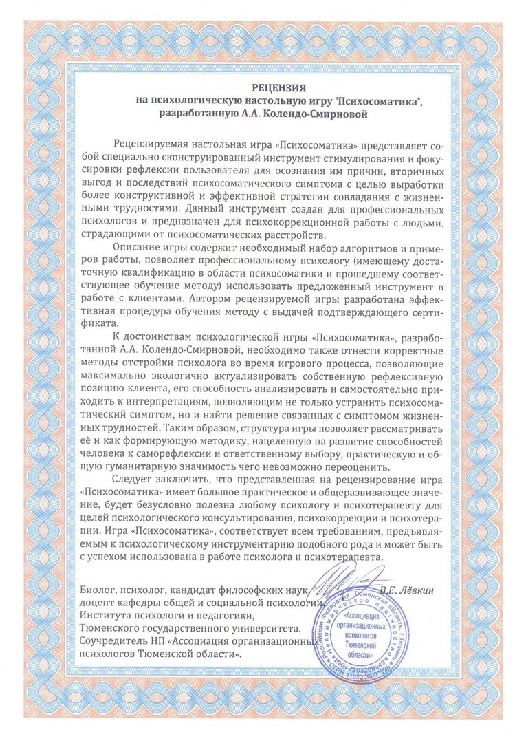Настольная психологическая игра «Психосоматика» является инструментом в работе психолога с людьми, страдающими психосоматическими расстройствами. В ходе игры происходит диагностика и анализ симптома. Игра «Психосоматика» позволяет рассмотреть симптоматику психосоматического расстройства с разных сторон и получить информацию для проведения дальнейшей терапии. Игра может применяться как в индивидуальной работе, так и в групповой (до 10-ти человек). Автор игры – Анастасия Колендо-Смирнова, дипломированный и сертифицированный психолог и гипнотерапевт, работающий в области психосоматики.