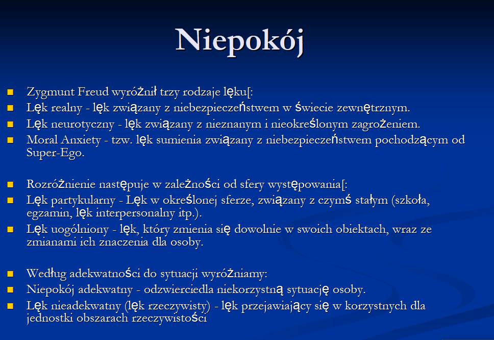 I tak, niepokój. Takie złożone pojęcie, tu na tym slajdzie oficjalne wersje tego, co to jest. Powiem ci w prostych słowach. Co to jest lęk? Nie możemy go zdefiniować, bo wszyscy, którzy z nim pracują, którzy piszą książki i tak dalej, nie zdefiniowali go. Zdefiniujmy to tak, aby podczas wykładu było jasne, co mam na myśli. Tak więc, ogólnie rzecz biorąc. Co będziemy odróżniać strach od lęku, w tym, że strach wyraża konkretnie obawę przed czymś, konkretność, natomiast lęk to taki stan ogólny, podniecenie. A w prostych słowach starałem się tu napisać, że lęk z określonego powodu to nadal lęk, a lęk bez powodu to nerwica. To samo, że lęk bez przyczyny też jest nerwicą. Tutaj podałem przykład Zaburzenia obsesyjno-kompulsyjne, może to być również hipochondria. I wszystko w zasadzie. Każdy neurotyczny lęk. Lęk i strach to w zasadzie to samo, tylko strach jest wyraźny, lęk jest niewyraźny. Dla obu są dwa stany. Stan normalny i stan neurotyczny. Normalne jest wtedy, gdy boję się czegoś normalnego. Jest dom w ogniu i jest strach. To jest logiczne, jasne, normalne. Kiedy siedzę i myślę, że co jeśli może dojść do pożaru, to mam nerwicę, bo nie ma takich warunków, nie ma sytuacji, która mogłaby stanowić jakieś zagrożenie, ale staję się niespokojny; to się nazywa nerwica.