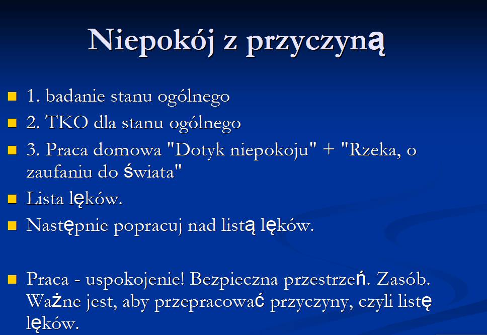 Następny. Praca domowa – dotyk niepokoju. Dotyk Lęku Podałem to ćwiczenie w webinarium na temat Depresji. Powtórzę to tutaj. To wtedy uczymy osobę świadomego dotykania lęku. Lęk często pojawia się u osób lękowych w momencie pojawienia się jakiegoś bodźca, na który dana osoba musi zareagować, a osoba lękowa chce zareagować szybko. I dlatego naszym zadaniem jest nauczyć człowieka dotykać tego pragnienia szybkiej reakcji, a także świadomie obserwować tę niespokojną reakcję w sobie. Jak to się dzieje? Prosimy osobę, by nie odbierała telefonów, nie pisała smsów, nie pukała do drzwi i generalnie nie odbierała żadnych telefonów zanim nie policzymy do 3, lepiej do 4. Ale są osoby niespokojne, które nie potrafią liczyć do więcej niż 2. Z nimi zaczynamy od 2. Raz, dwa i dopiero po tym odbieramy telefon. W tym momencie osoba lękowa będzie miała w środku takie bezpośrednie przerażenie, bo chce zareagować. I musi zrobić próżnię, że zrobię to w 2 sekundy, a te 2 sekundy, będą wydawały się czymś niewiarygodnym, długim, strasznym. Ale poprzez ten dotyk niepokoju hartujemy go i jeśli w pierwszym tygodniu robi to przez 2 sekundy naraz, to w następnym tygodniu jest w stanie zrobić to przez 4 sekundy. W następnym tygodniu jest w stanie zrobić to przez cztery sekundy. A ogólny niepokój obniża się dzięki możliwości podtrzymania tego napięcia w sobie. To jest hartowanie, to tak jakbyśmy hartowali osobę, hartowali mięśnie. Te akcenty są małe, ale pompują. A jedno z moich ulubionych ćwiczeń to "Rzeka, na zaufanie do świata" to też symbol dramatu, można tak powiedzieć. Myślę, że to mieszanka, bo w klasycznym dramacie symbolicznym tam rzeka wygląda inaczej. W każdym razie wyzwanie jest takie. Codziennie wyobrażać sobie, że człowiek kładzie się na plecach w wodzie, na wyimaginowanej rzece i patrzy jak rzeka go niesie. I tak musi się nauczyć spokojnie leżeć w wodzie. Na początku bardzo się boi. Poza tym, rzeka musi być inna. Czasem może trafić na pokład, czasem na małe obniżenie w tej rzece, różne rzeczy mogą pływać i człowiek musi nauczyć się ufać tej rzece, po prostu płynąć z prądem. I obserwuj. Tak, to co mam dzisiaj jest ciekawe, tu rozbicie o pokład, kłoda pływająca obok. To znów nutka niepokoju, ale w bezpiecznym miejscu. To znaczy, że jest się w swojej wyobraźni, nic jej nie zagraża. Ale właśnie w tej wyobraźni hartuje się, dotykając tych trudności, które pojawiają się na jego drodze. I to jest właśnie takie ćwiczenie, które jest zarówno, ćwiczeniem treningowym. Terapia behawioralna. Kiedy pielęgnujemy w sobie nową reakcję. Tworzymy nowe połączenie neuronowe, reagujemy. Robimy je od podstaw, z grubsza rzecz biorąc. Po prostu hartowanie się, trenowanie siebie. Czy nie była to umiejętność? Rozwijamy tę umiejętność. Te dwie techniki sprawdzają się bardzo dobrze. Również jeśli mężczyzna jest bardzo podejrzliwy, religijny lub indoktrynowany w sensie rzeczy ezoterycznych. Możesz też zaproponować mu ćwiczenie – Odpowiedzi z Wszechświata. Kiedy jego zadaniem jest zadawanie pytań – szukanie odpowiedzi, aby oprócz ćwiczeń, które wykonuje. Dzięki temu nauczy się czuć podstawowe bezpieczeństwo, zobaczy, że świat mu odpowiada, że nie jest sam. Jeśli otrzymuje odpowiedź, to znaczy, że jest potrzebny, że jest częścią tego świata. Podstawowe zaufanie świata. Następny. Lista lęków. Bo ten lęk ma specyficzne lęki, bo, tu przychodzi osoba, boję się tego, boję się domu, boję się tego, ma specyficzne, pęczek, dużo różnych lęków. I prosimy o wpisanie tych wszystkich lęków do pracy domowej – w formie listy. I tak, kiedy osoba przychodzi z tą listą, oceniamy każdy lęk od 0 do 10 i pracujemy tak, jak już robiliśmy to na slajdzie o Lęku. Wszystko oceniamy, wszystko co jest 3-4 zostawiamy nietknięte, z tymi co są 8-10, dużymi liczbami, pracujemy z nim w gabinecie. Za pracę domową dajemy najmniejsze, jest ich 5-6. Np. cała lista, a tu boi się jeździć autobusem za 5-6, a ma lęk o swoje zdrowie, za 10. W takim razie zrobię jak. W gabinecie zrobię uzdrowienia za 10, a w pracy domowej dam jej strach za 5-6 CAT i niech robi to w spokoju. Bardzo podoba mi się również technika strachu, działa bardzo dobrze. Działa bez przeciwwskazań. Nadaje się nawet dla kobiet w ciąży. Gdy wybieramy kolor strachu – arteterapia. I pozwalając sobie na doświadczenie tego lęku, znowu widzicie, dotykając tego lęku. Bo zazwyczaj jak człowiek się czegoś boi, to boi się myszy i nie myśli o nich. Myśli i jakoś czuje się nieswojo, a nie myśli o nich. I tu musi powiedzieć: jakiego koloru jest mój strach? Szary, jak mysz. Śmiało, weź kartkę A4 i pomaluj ją szczegółowo, pozwalając sobie na myślenie o swoich lękach w tym momencie, na myślenie o tych myszach. I oto wyobrażam sobie, jak mnie gryzą, jak pełzają po mnie. I to wszystko, czego się boi, to tylko malowanie po kartce papieru. Pomalował całą kartkę A4 i zadał sobie pytanie? Czy kolor strachu się zmienił, czy nie? I być może z takiej ciemnej mysiej szarości przeszła do jasnej szarości. Fajnie, weź następny arkusz, jasnoszary i zazwyczaj przy 3 arkuszu część strachu już zniknęła. Takie rzeczy, tak, za 5 lub 6, i zabieramy do domu do osoby. Tak, jeśli pracuje się z tym samym psychokatalizatorem, to dajemy mu go również za 5-6. Tutaj robisz to w domu. Albo przeprowadzasz z nim kiedyś psychokatalizę w swoim gabinecie. Dla tych, którzy nie wiedzą, czym jest psychokataliza, pozwolę sobie wyjaśnić. Andrey Fedorovich Yarmoshin, autor psychokatalizy, metody. Łatwo zapamiętać, że chodzi o rzeczy w ciele. A w dużym skrócie byłoby to tak. Wszystko bierze się stąd, że ciało rejestruje nasze lęki w sobie, w postaci pewnych doznań, które możemy tłumaczyć jako pewne obiekty, jeśli chcemy. I teraz bardz