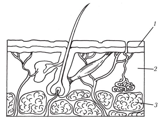 Рисунок 1. Строение кожи: 1 – эпидермис, 2 – дерма; 3 – подкожная клетчатка
