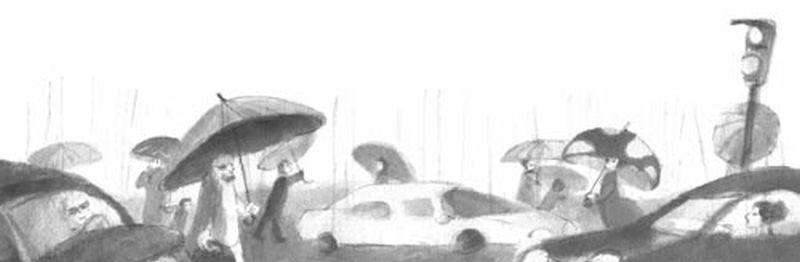 У машины, съёжившись под дождём, стоял Кеша. А рядом с ним – человек в фуражке и с полосатой палкой, который тоже, как мог, пытался съёжиться. Только у него плохо получалось, потому что он был очень крупный человек. Такой крупный, что фуражка еле налезала на его голову и совсем не прикрывала от дождя уши и затылок. Оба мокрых человека разглядывали мокрые бумажки и хмурились.