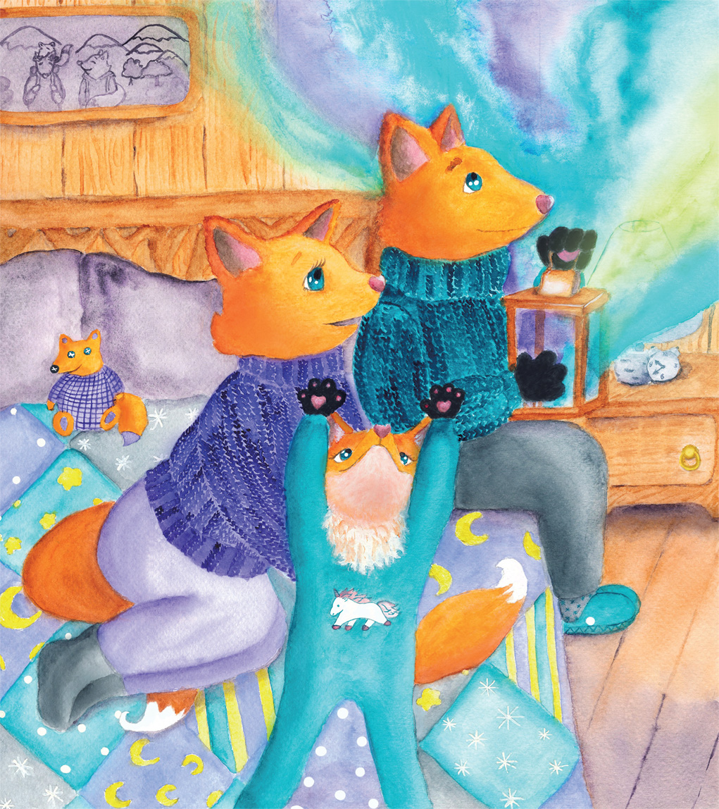 Когда вечерний чай с ягодами был допит, мордочки умыты, а зубки почищены, Катенька с маленьким братиком, мамой и папой улеглись в кровать. Мама зажгла чудесную лампу, и все разом ахнули, увидев, как комнату наполнил необычный свет.