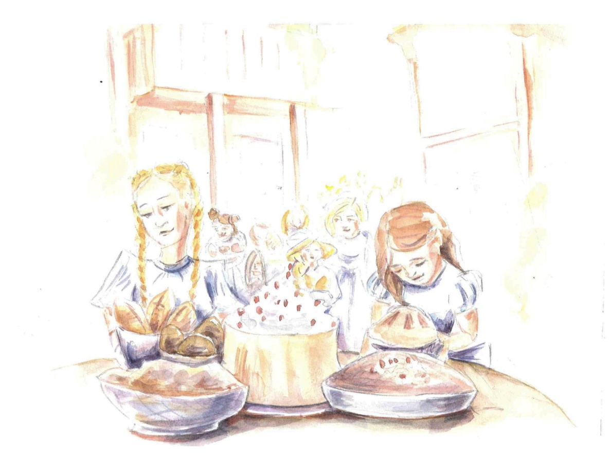 Королевская семья подоспела как раз к началу обмена угощениями между жителями города и праздничными песням. На улицах были сотни радостных лиц. Все ходила с широкими, совершенно искренними улыбками и различного рода стряпнёй. Особенно выделялись на фоне всех яств сделанные своими руками фирменные семейные караваи. На каждом из таких пирогов были изображены традиционные знаки семьи или отличие данной семьи от другой и род занятия семейства, например: колосья пшеницы, над которыми возвышались звёзды из теста, говорили о том, что в роду этих фермеров были звездочёты, которыми очень гордятся их потомки, топор дровосека из теста, с надписью «Грамота» на лезвии, рассказывал, что предки или предок этих лесорубов были учителями и ещё много интересных, а порой и смешных, и странных историй можно было прочесть по узорам на праздничном семейном каравае. Это являлось одним из любимейших занятий детей королевства. Нашим ребята тоже очень нравилось читать истории города на таких изумительных на вид и вкус пирогах.