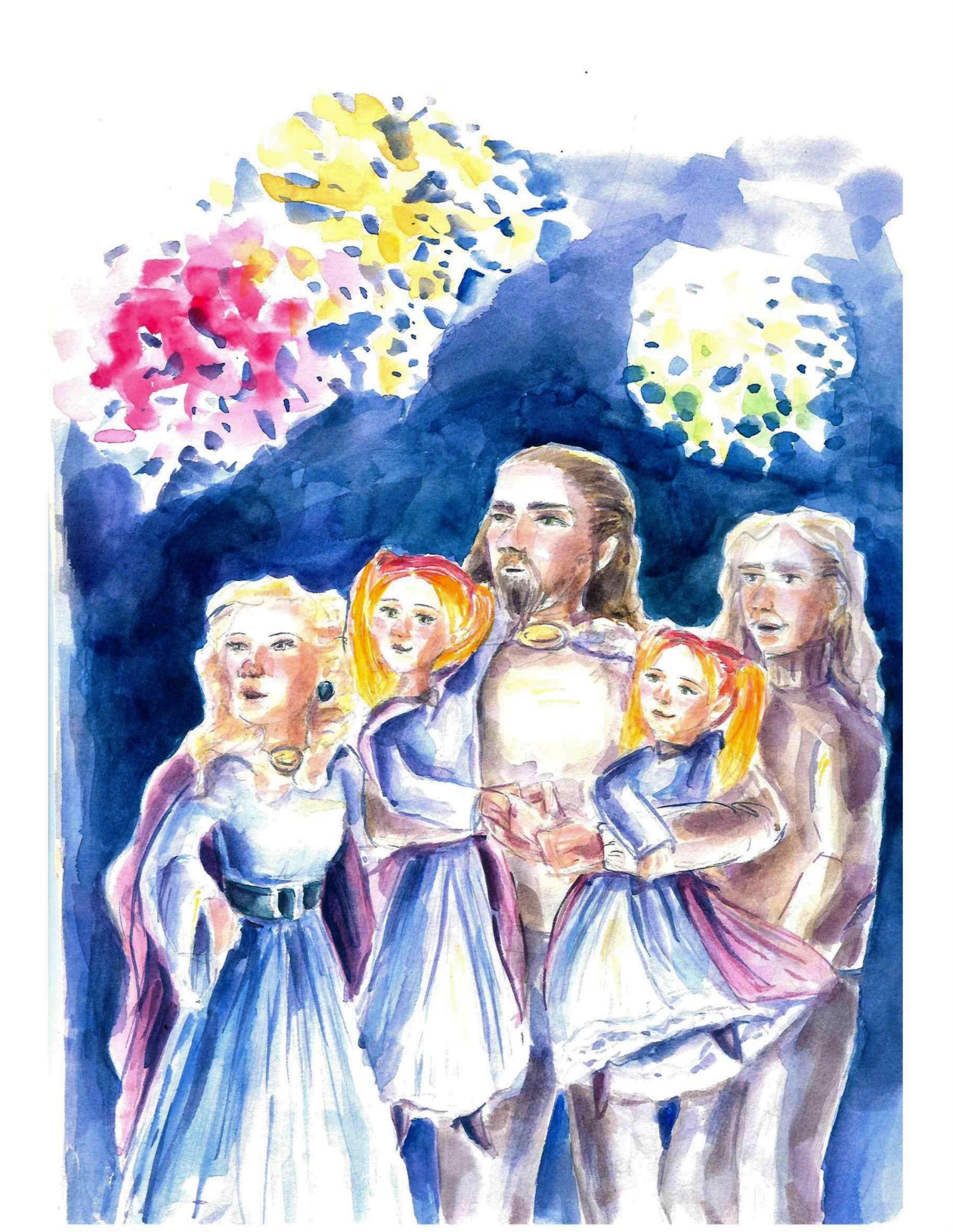 Люди выбежали из своих домов и с широко раскрытыми глазами наблюдали, как такое тёмное сумрачное небо превратилось в живописную картину с сияющими цветными огромными звёздами. С таким же удивлением и неописуемым восторгом смотрели вверх и вдаль, и вокруг себя члены семьи затейливых сестричек, а после того, как все огни разошлись только Курант смог найти, что сказать юным, однако уже таким смышленым принцессам. Он говорил медленно, тихо и с любовью к ним следующие слова: