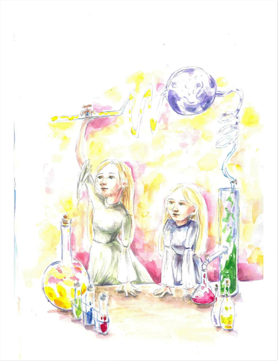Сказав это, она пододвинула стул к столу, взобралась на него, достала коробку, в которой лежали множество мешочков с красящими пигментами, и положила её на их с Корой рабочее место. Работа шла быстро, Сэр Странник говорил правду о таланте девочек и не зря верил в них и их изобретательность. Через час все растворы были готовы, только с тремя из них произошёл небольшой казус. Пока девочки переливали их в нужные сосуды, склонив обе головы над первыми плодами задумки, растворы пыхнули в лица сестёр цветными парами, однако юные алхимики успевали отвернуть головы и сделать полшага назад, так что лица их были спасены от красного, жёлтого и небольшого оранжевого паров.
