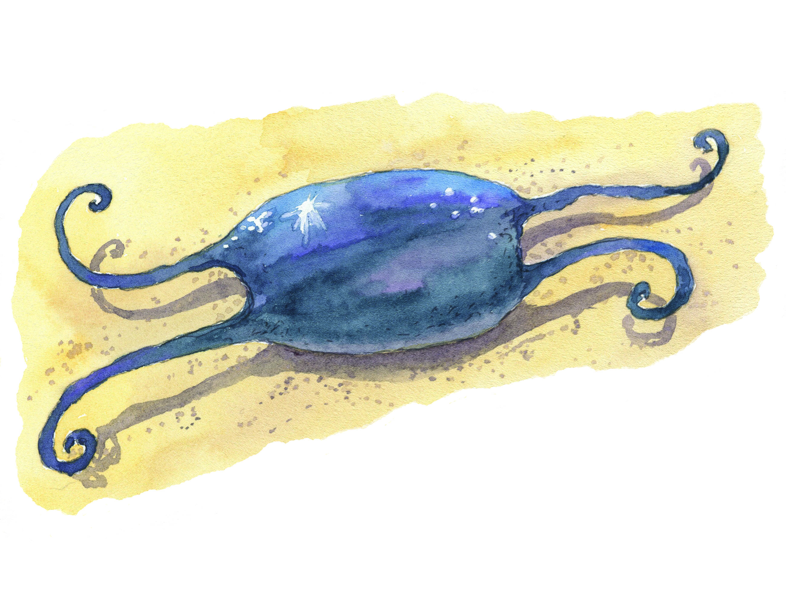 На берегу она находила множество разных интересных вещей: ракушек, водорослей, разноцветных камней. Но вот ей попался предмет, названия которого она не знала. Он был похож на небольшой чёрный мешочек с четырьмя лентами-завязочками по углам. Внутри него что-то лежало, и Лора хотела узнать, что именно, вот только у мешочка не было ни молнии, ни пуговиц.