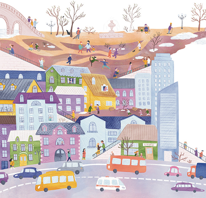 А там – кутерьма: улицы и дома. А там – дороги, тропинки, арки, мосты. А там – большие деревья и маленькие кусты. Вот люди – идут и идут. Вот люди – стоят и чего-то ждут. А вот машины. А какие у машин круглые колёса!
