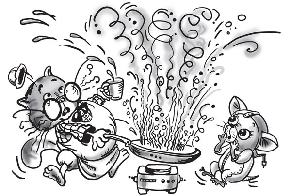 Масло, которое он разогревал на сковороде, не только уже вполне разогрелось – оно горело! Мямлик схватил кружку с водой и вылил ее в сковороду, Раздался хлопок. Огромный столб пламени взметнулся к потолку, опалив коку усы и мгновенно окрасив стены копотью. Котя в ужасе завизжала. Откуда-то сбоку вынырнула лапа и набросила на плиту ковер. Понесло паленой шерстью, но огонь потух. Мямлик стоял как пораженный громом, бессмысленно таращась на почерневшую стену.