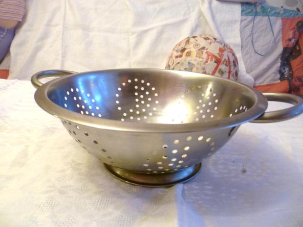 Первый этап – шарик нужно надуть. Не слишком туго, чтобы он не лопнул от ваших прикосновений. Если у вас спанч-болл, вы можете подвесить его за резиночку. Если у вас обычный шарик, то для его фиксации при оклеивании вы можете использовать дуршлаг или другую посуду (см.фото).