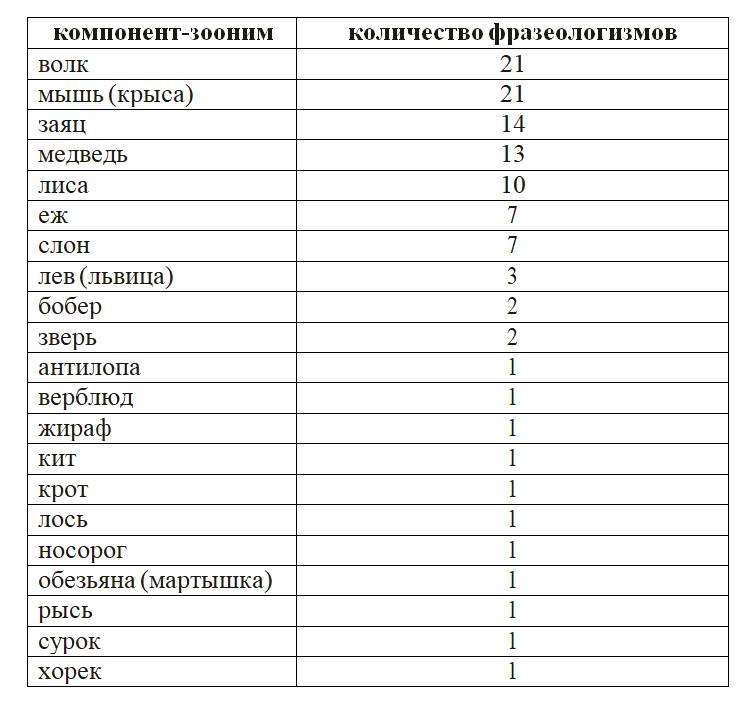 Наиболее частотными являются такие компоненты, как медведь, волк, заяц, мышь (крыса), лиса. Эти животные считаются национально-культурными символами, через сравнение с ними максимально точно передаются особенности характера, черты, манеры, поведение человека.