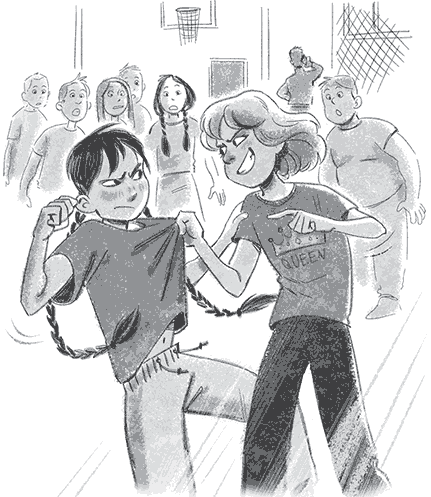 Оля, Туяра и две их подружки перешёптывались, сидя на скамейке. Внезапно Николаева резко развернулась и встала над Яной.