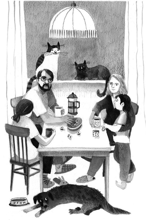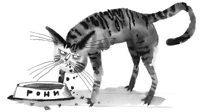 Рони в этот момент гонит кота из комнаты, но же возвращается, язык на боку, глаза блестят любовью: