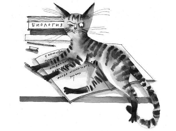 Больше всего от Фимы достаётся Варе. Кота начинает выворачивать наизнанку, когда Варя садится за уроки. Он лезет печатать на ноуте, ложится на тетрадь так, что его не сдвинуть, грызёт ручку, отнимает карандаши, сбрасывает со стола резинки, точилки, линейки, плюётся, ругается, философствует.