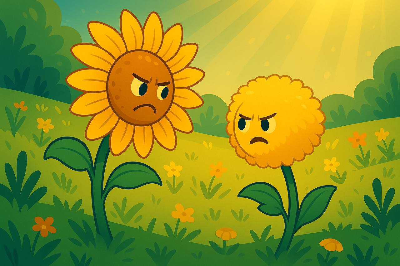 На солнечной полянке, среди густой зелёной травы, росли два соседа: высокий, золотистый Подсолнух по имени Соломир и пушистый, жёлтый Одуванчик по имени Люсса. С утра до вечера они спорили между собой.