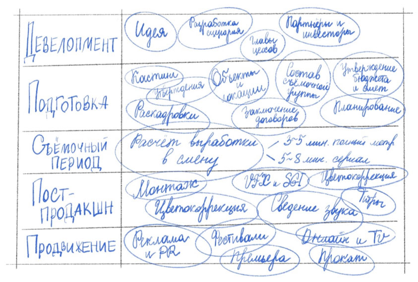 – прочие встречи (актёрские читки, раскадровки и блокировки, утверждения смет, планирование отдельных сложных сцен и т. д. и т. п.).