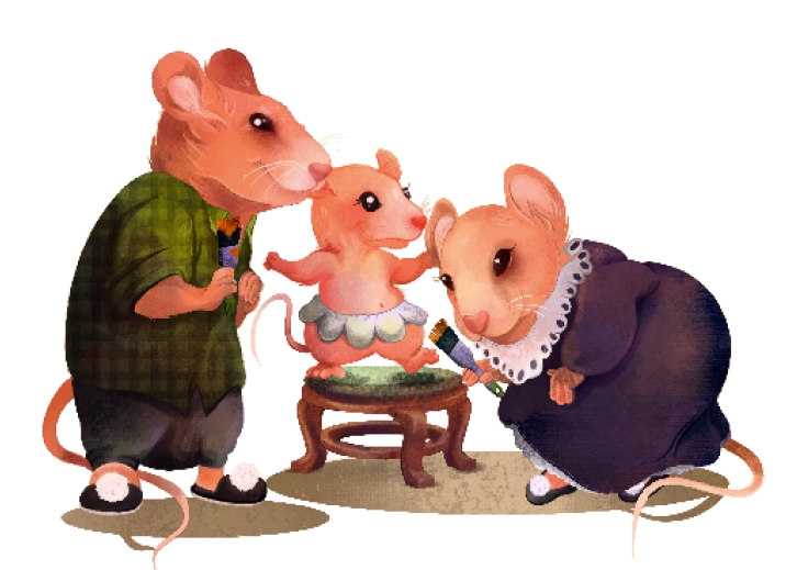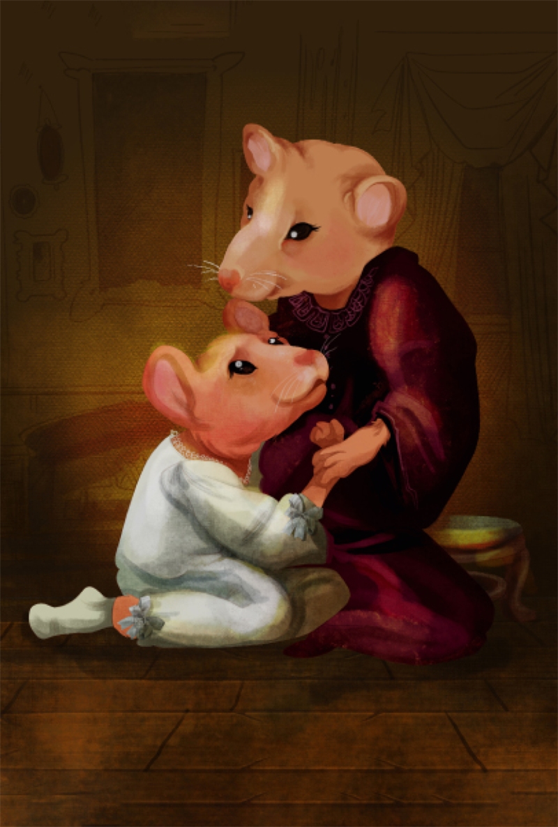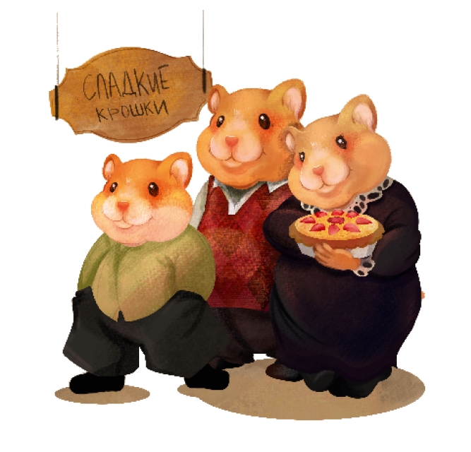 Соседями семьи Мориса, Луизы и Марлин были добрые смешные хомячки-белогрудики. Белые пятна их пузиков были похожи на накрахмаленные рубашки и блузы конторских клерков. Постоянно жующие рты, прекрасный аппетит, страсть к кулинарии делали их смешными героями постоянных незлых насмешек в колонии хомяков. Их любили, а учитывая, что их мама, мадам Бон-Бон, держала маленькую лавку «Сладкие крошки», семью белогрудиков – маму, папу и маленького сыночка Пуша – знали все.