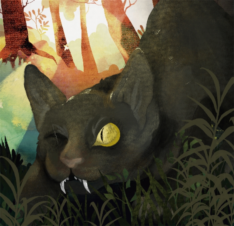 В этот самый момент грозная тёмная тень промелькнула перед ними. Марлин и Пуш замедлили свой ход. Что‐то большое и страшное шло им навстречу, Марлин и Пуш замерли. Ужас заливал лощину по-настоящему. Пуш лёг на землю, прижал уши и подготовился к худшему. Марлин тоже замерла. Сердце её застучало, как барабан, лапам стало тесно в башмаках. Силой стали наливаться маленькие, невероятно крепкие лапы. Неожиданно прямо перед ними из тумана появилась хищная морда большого лесного одноглазого кота.
